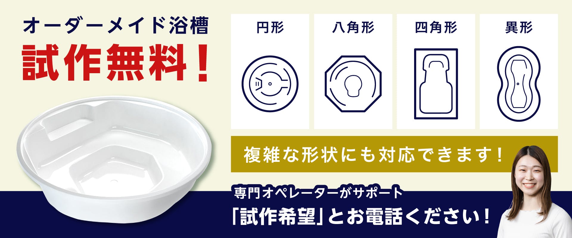 浴槽専門店「浴槽試作販売.com」をご覧いただきありがとうございます。当サイトでは高品質の浴槽の試作を無料で行っております。真空成形機を使った国内最大級の浴槽が製作可能です。また、耐久性に優れたFRA素材を使用しておりますので、質が高く、長くご使用いただけます。型代無料の浴槽も販売していますので、お客様にぴったりの浴槽がきっと見つかります。