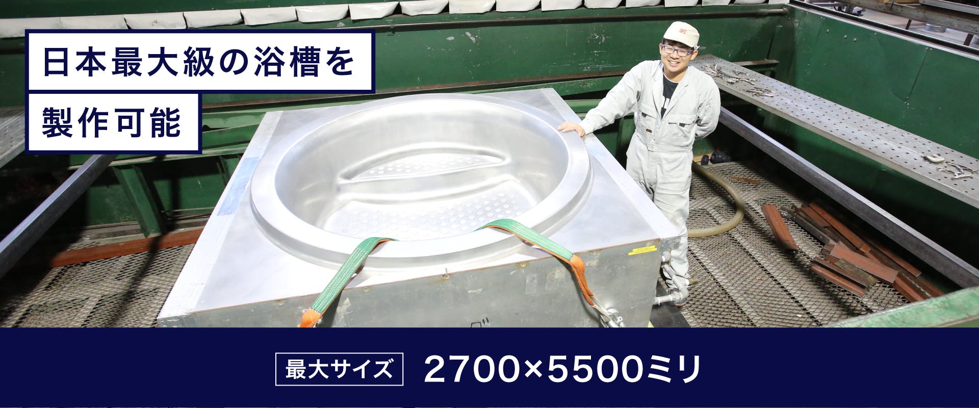 国内最大級の真空成型機を使った最大2700×5500mmサイズの浴槽が製作可能です。限られた空間から広い空間まで、あらゆるサイズの浴槽に対応できるため、お客様の要望にもしっかり対応できます。